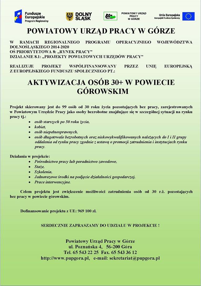 Projekt pt. "Aktywizacja 30+ w powiecie górowskim " w ramach Działania 8.1 „Projekty powiatowych urzędów pracy" Regionalnego Programu Operacyjnego Województwa Dolnośląskiego współfinansowane przez Unię Europejską ze środków Europejskiego Funduszu Społecznego.