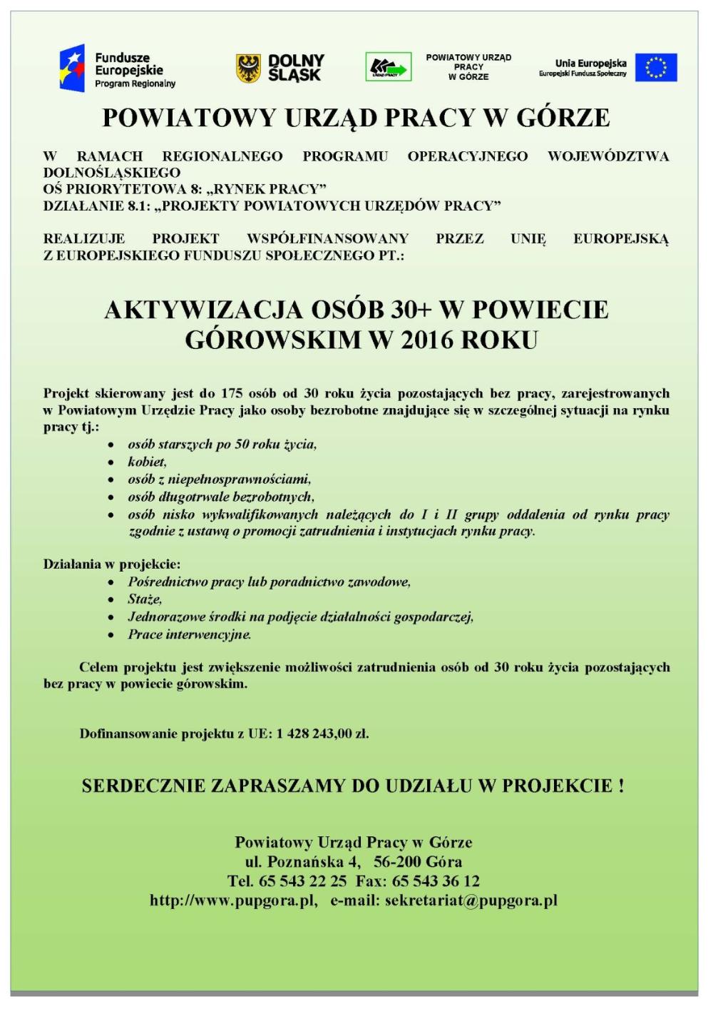 Projekt pt. "Aktywizacja 30+ w powiecie górowskim w 2016 roku " w ramach Działania 8.1 „Projekty powiatowych urzędów pracy" Regionalnego Programu Operacyjnego Województwa Dolnośląskiego współfinansowane przez Unię Europejską ze środków Europejskiego Funduszu Społecznego.