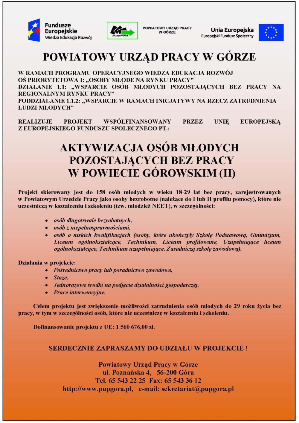 Projekt pt. "Aktywizacja osób młodych pozostających bez pracy w powiecie górowskim (II)" w ramach Poddziałania 1.1.2 PO WER w 2016 roku